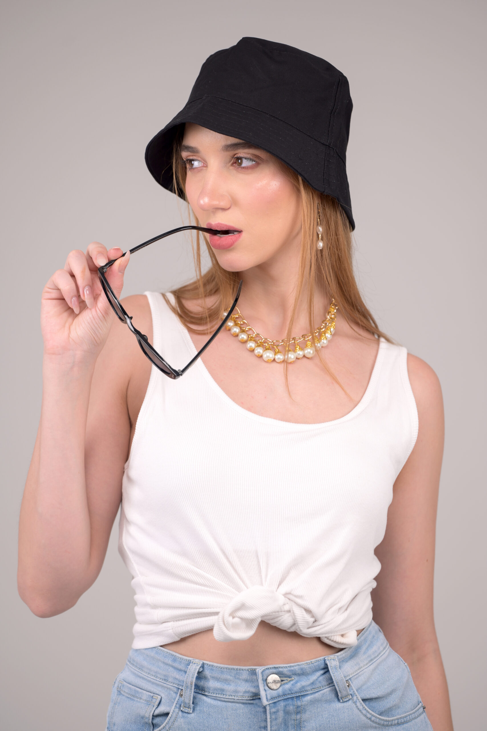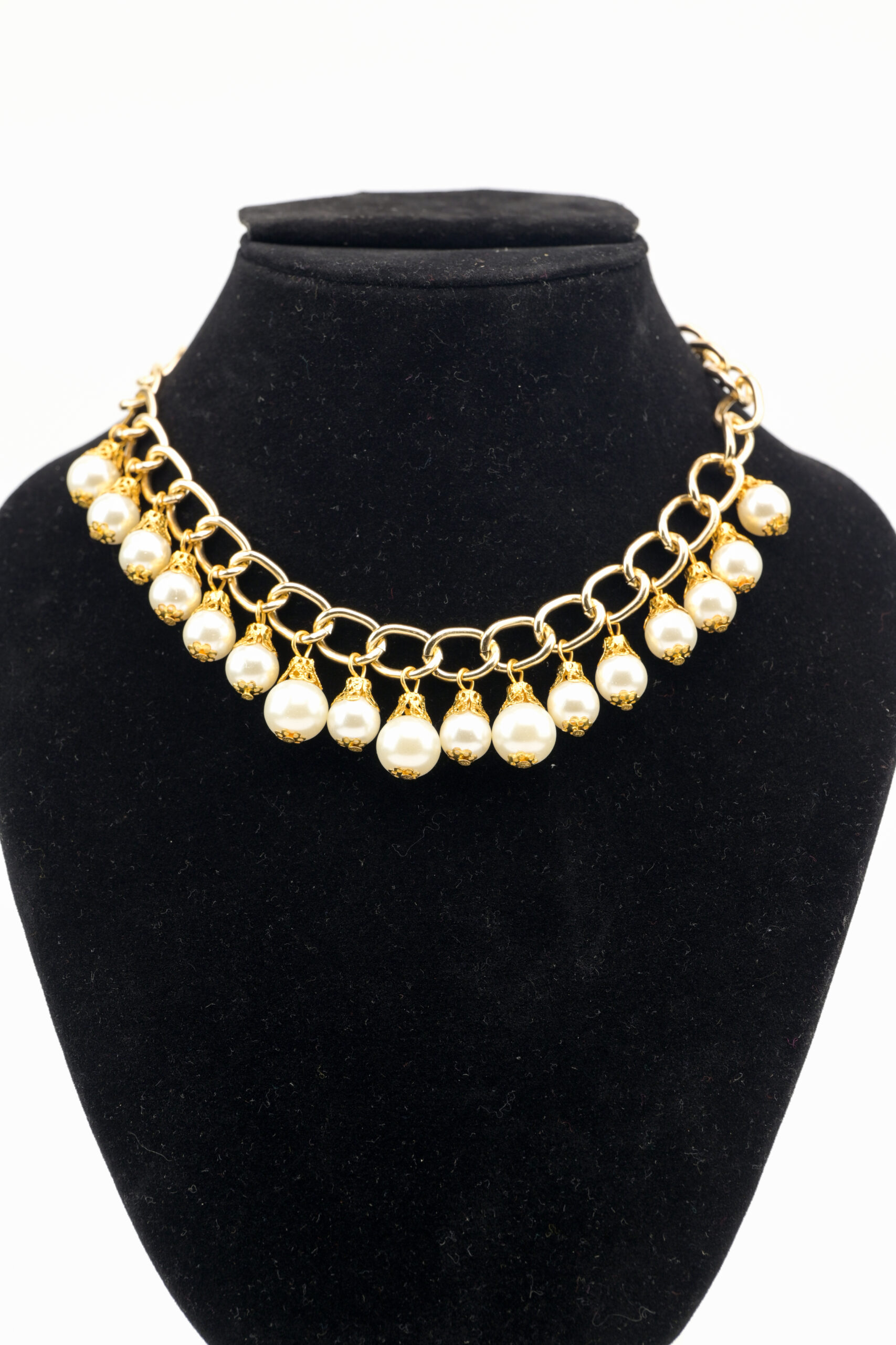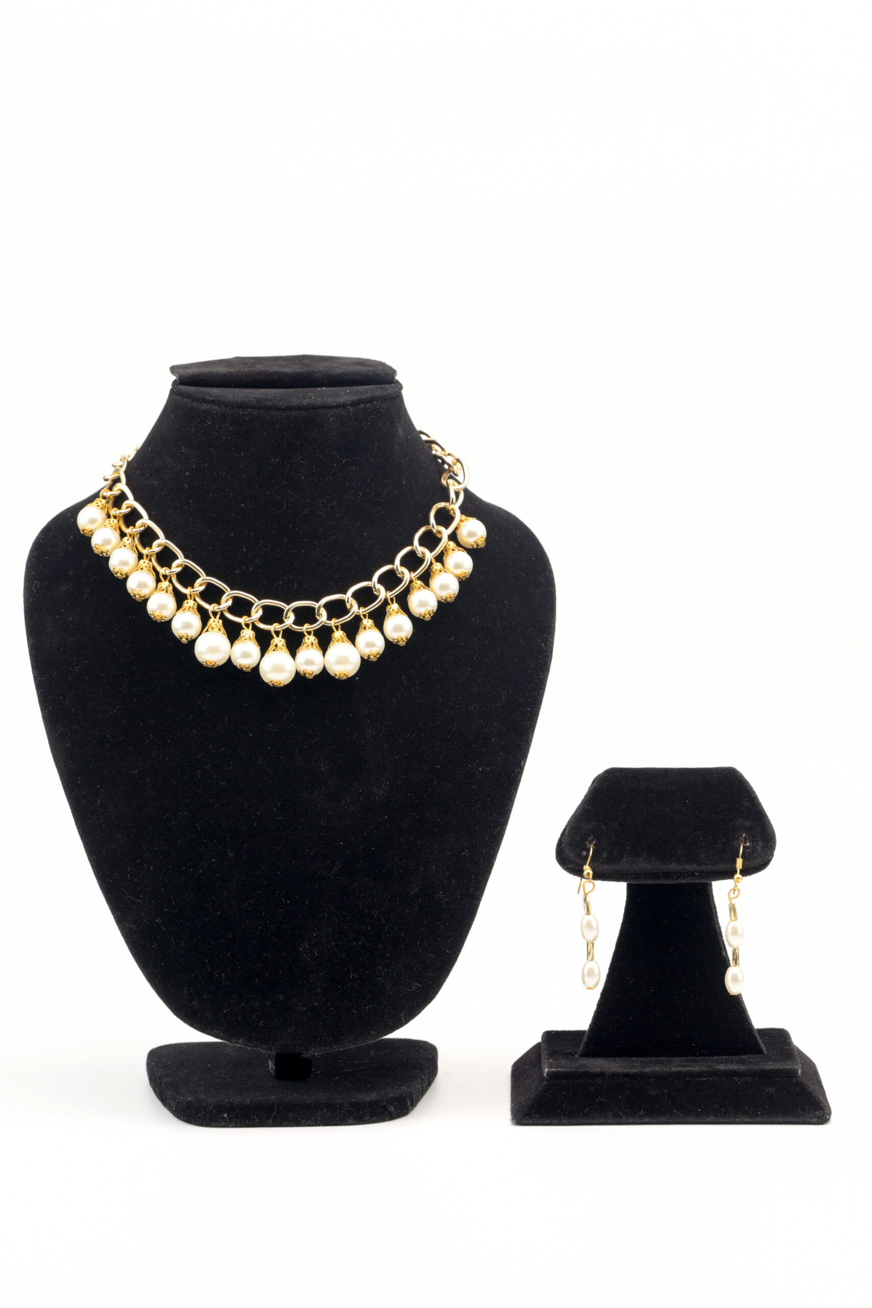 • Necklace: Gold-toned chain-link design adorned with drop pearls, forming a graceful fringe effect.