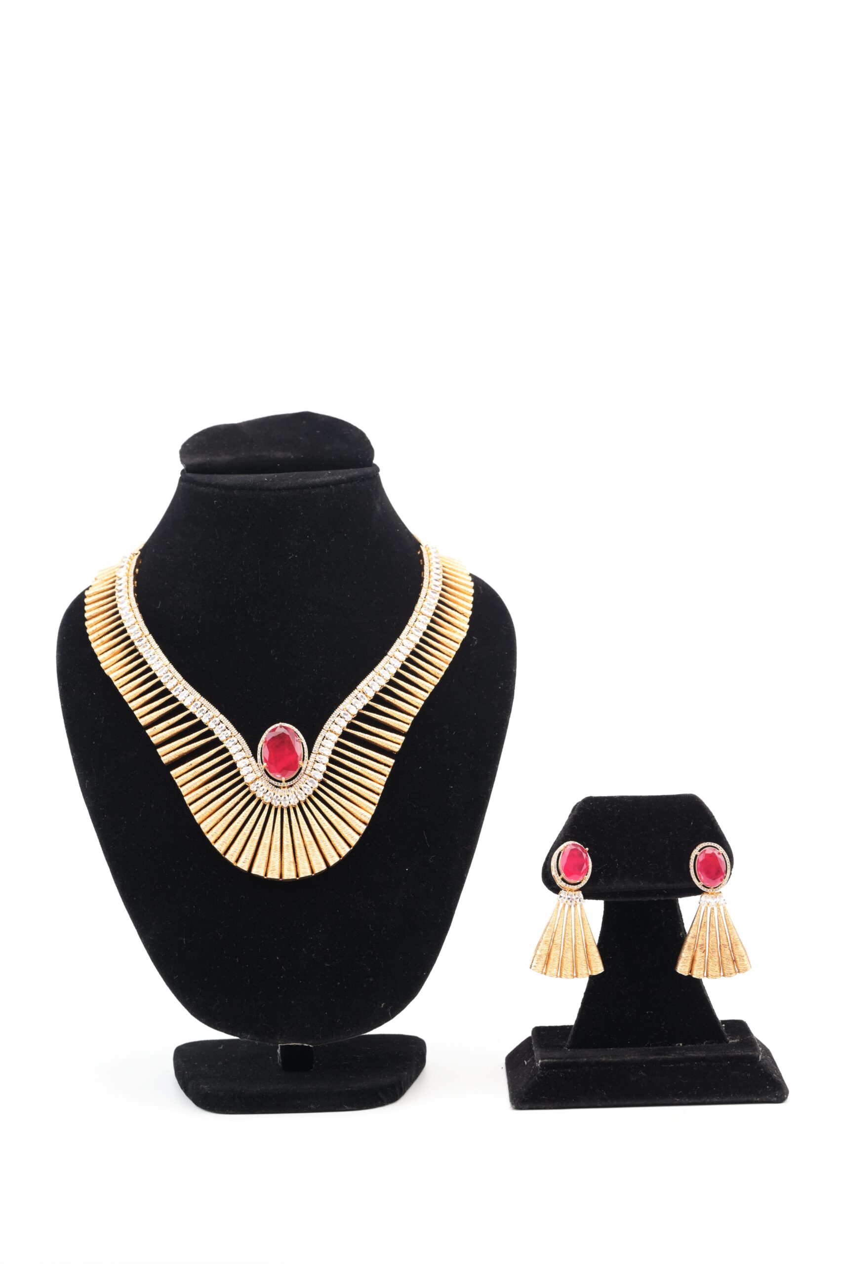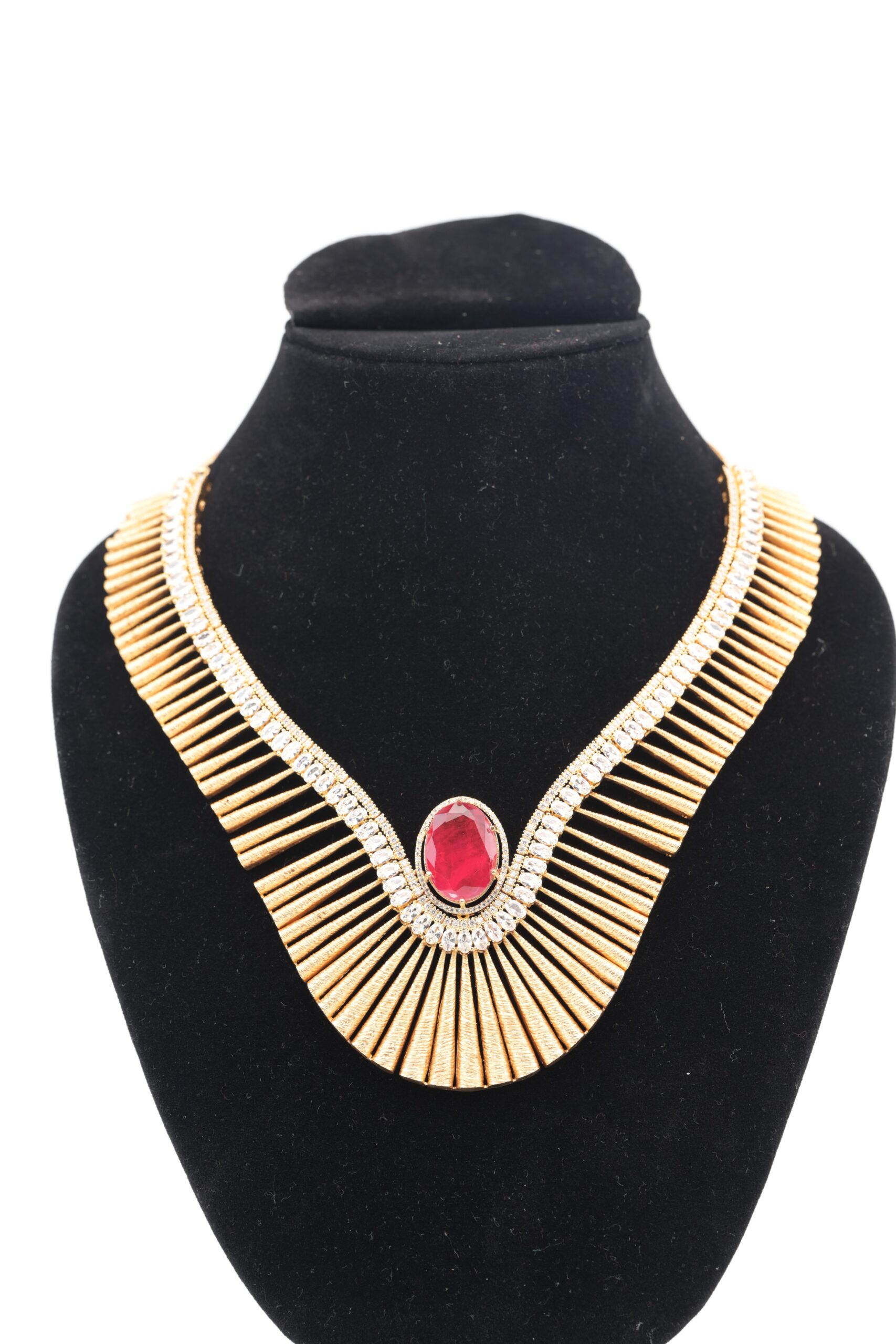 • Necklace: Bold V-shaped design featuring textured, fan-like gold-plated elements radiating from an oval-cut crimson cubic zirconia pendant, surrounded by a halo of multi-faceted sparkling stones.