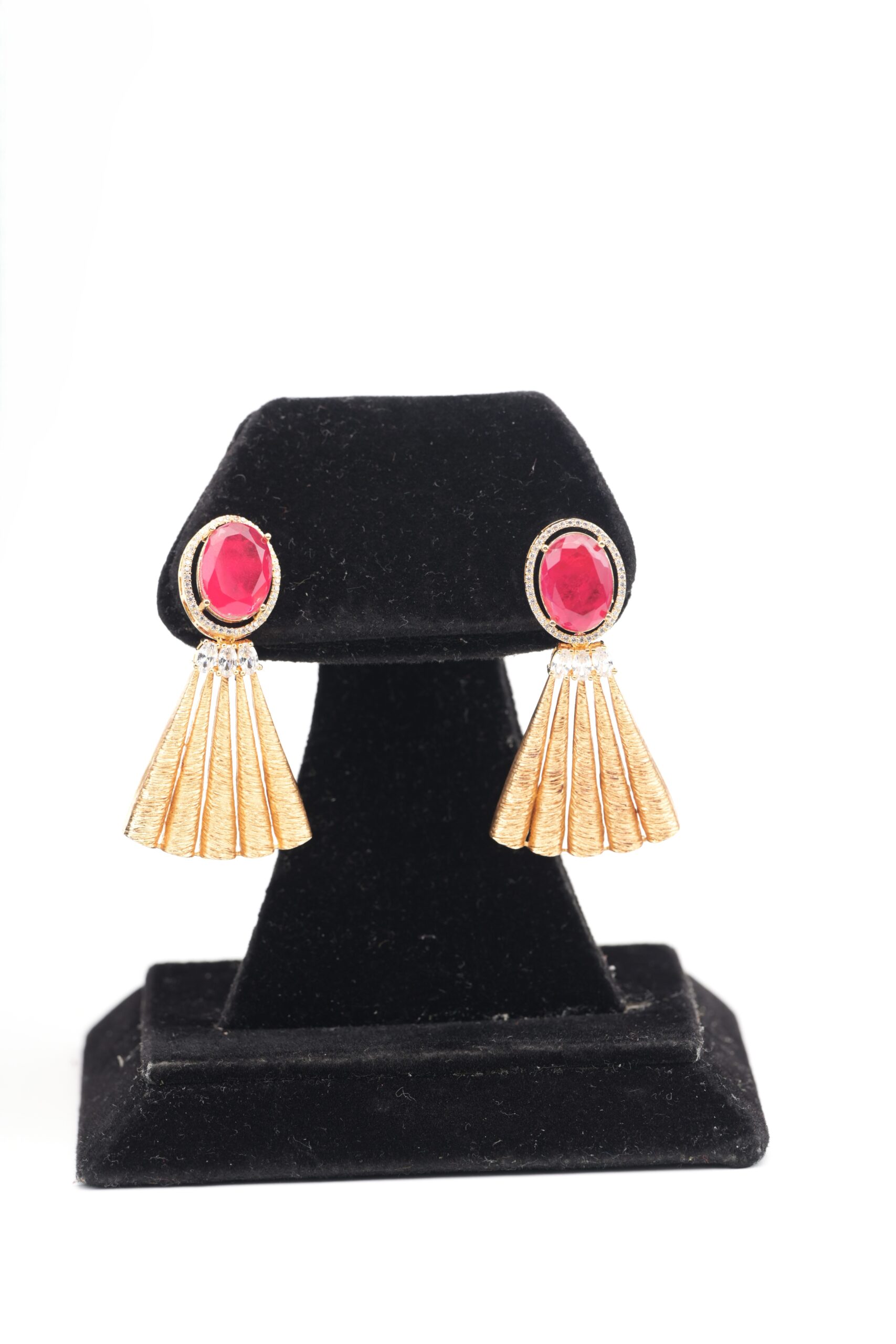 • Earrings: Matching round-cut crimson CZ stud with a graceful fan-shaped drop, echoing the necklace’s dramatic style.