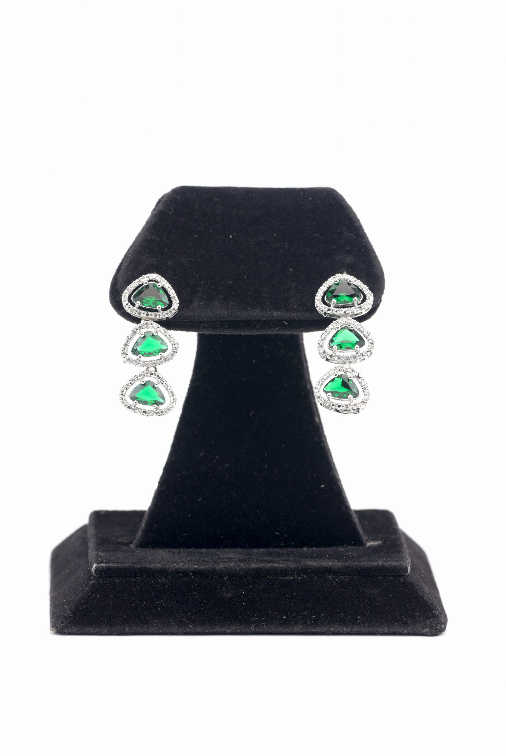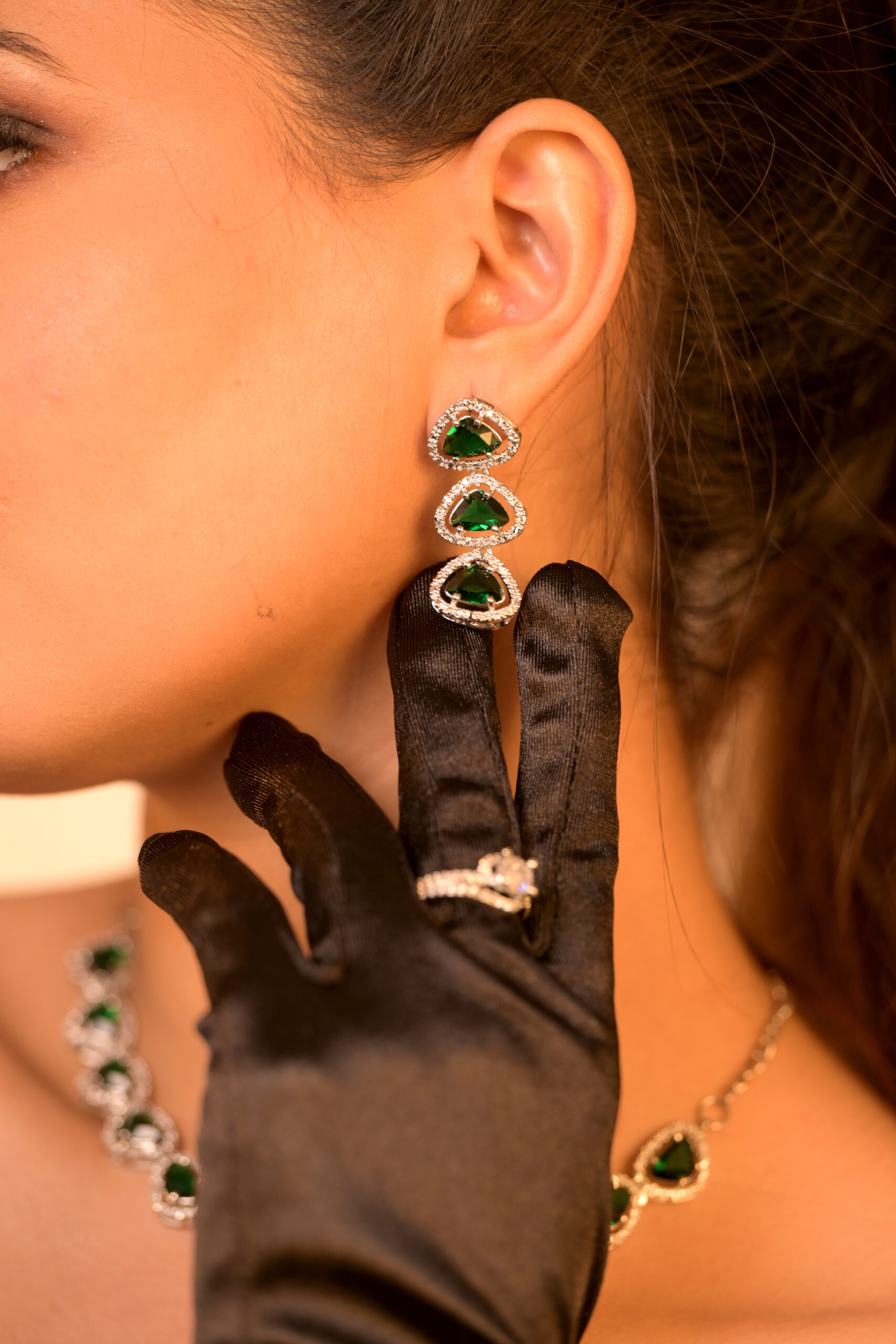 - Earrings: Elegant triple-drop earrings featuring matching heart-shaped emerald stones, highlighted with sparkling pavé detailing for a luxurious finish.