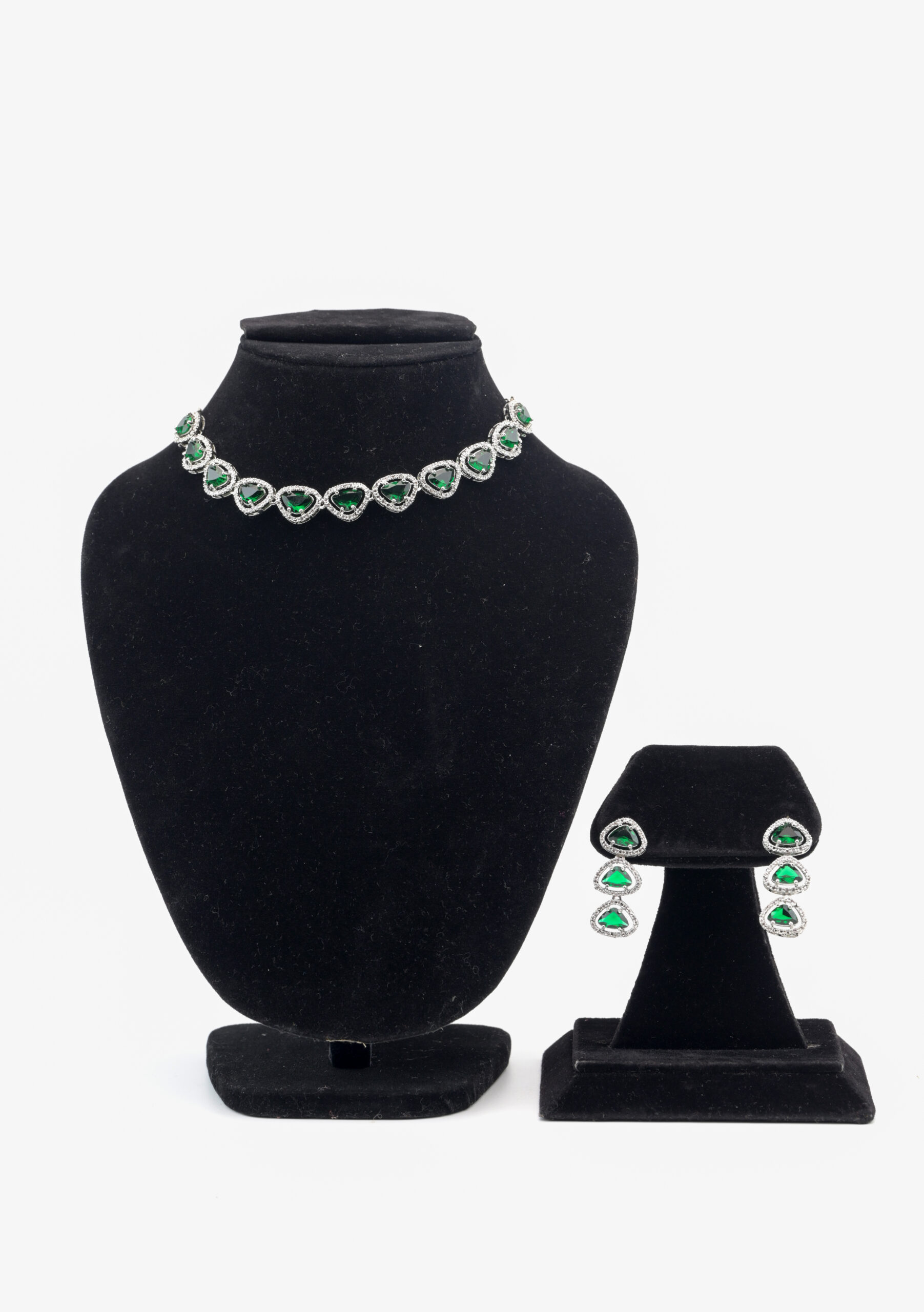 - Necklace: A graceful arrangement of heart-shaped emerald stones, each encased in pavé-set cubic zirconia, linked seamlessly to create a dazzling collar effect.