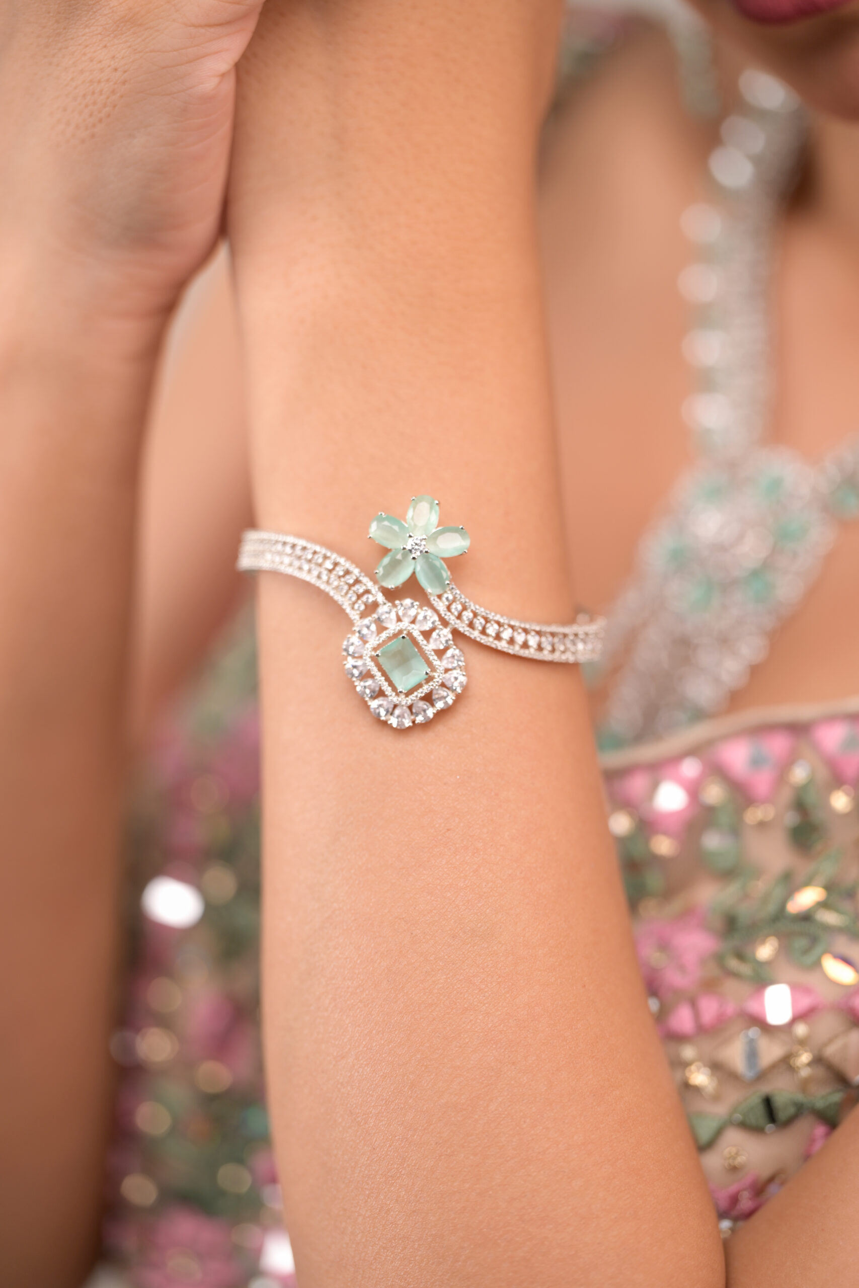 Step into refined glamour with the Mint Elegance Set, a stunning ensemble combining sparkling AD-CZ, and delicate mint-hued accents. The statement necklace features a floral-inspired central motif with cascading drops, set on a chic chain of brilliant-cut stones and lustrous glass pearls. Complementary chandelier earrings offer intricate dangling elegance, while the adjustable open-cuff bracelet adds a contemporary finish with a square-cut stone and floral detail—ideal for weddings, receptions, or festive occasions.