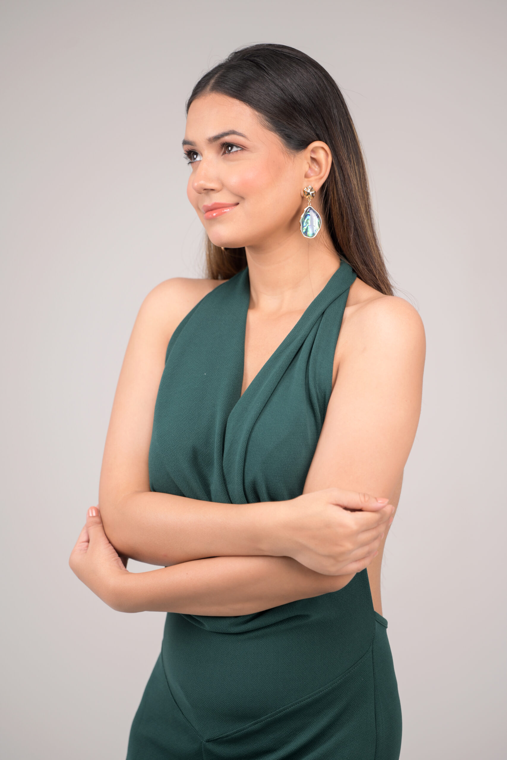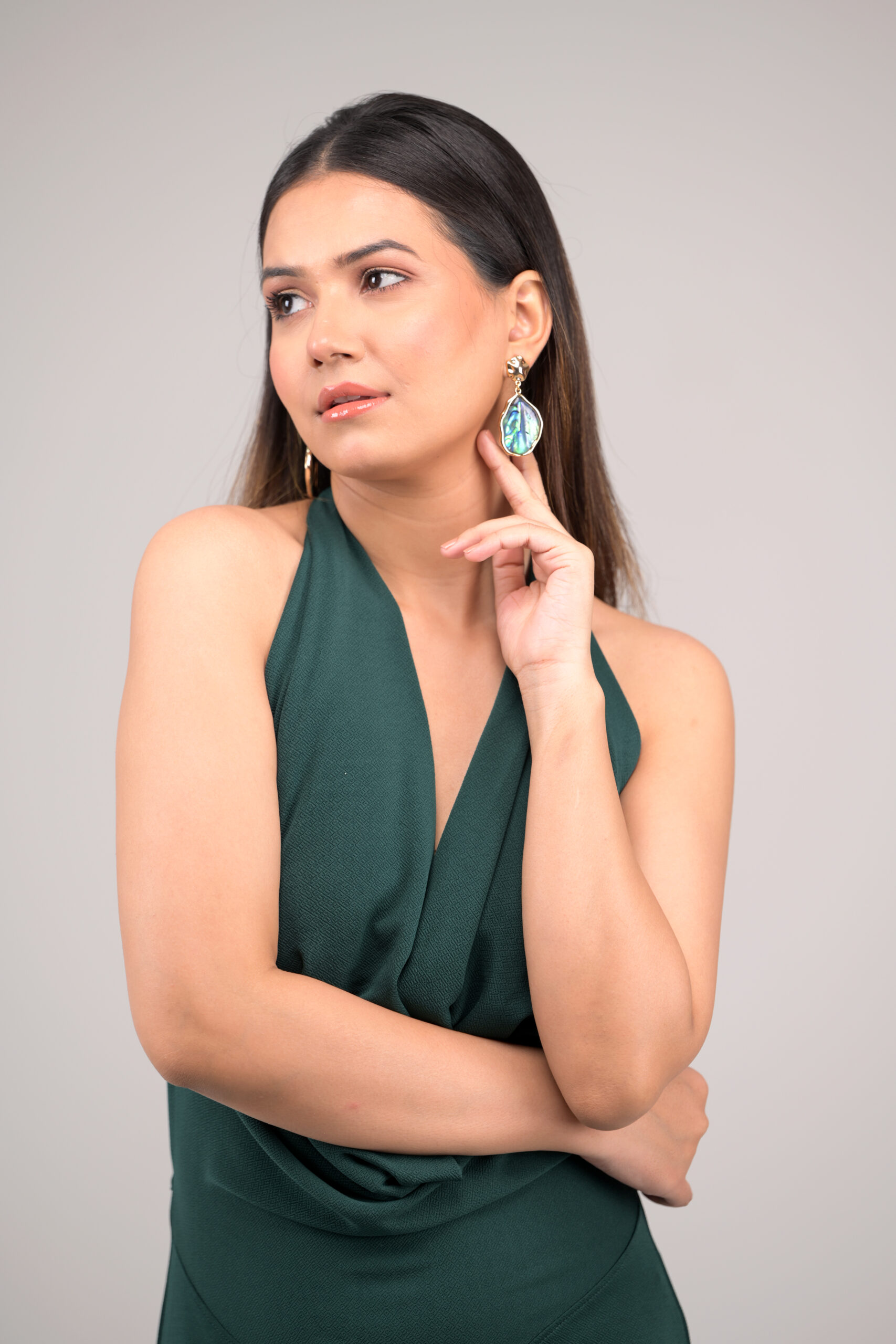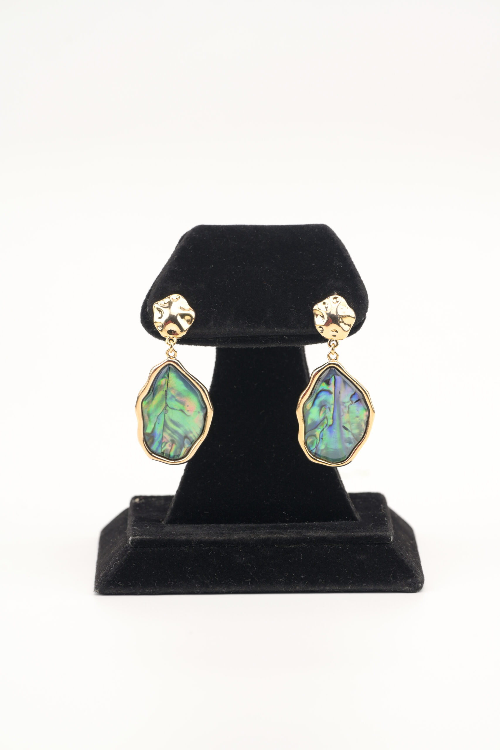 Elevate your look with the Organic Gemstone Drop Earrings, showcasing an artistic fusion of natural textures and modern design. Each earring features an organic hammered gold-toned stud, from which hangs a free-form abalone shell-like composite stone shimmering with iridescent blues, greens, and purples. The textured gold-toned setting beautifully frames the unique gemstone, creating a bohemian yet sophisticated accessory perfect for adding a statement to any outfit.