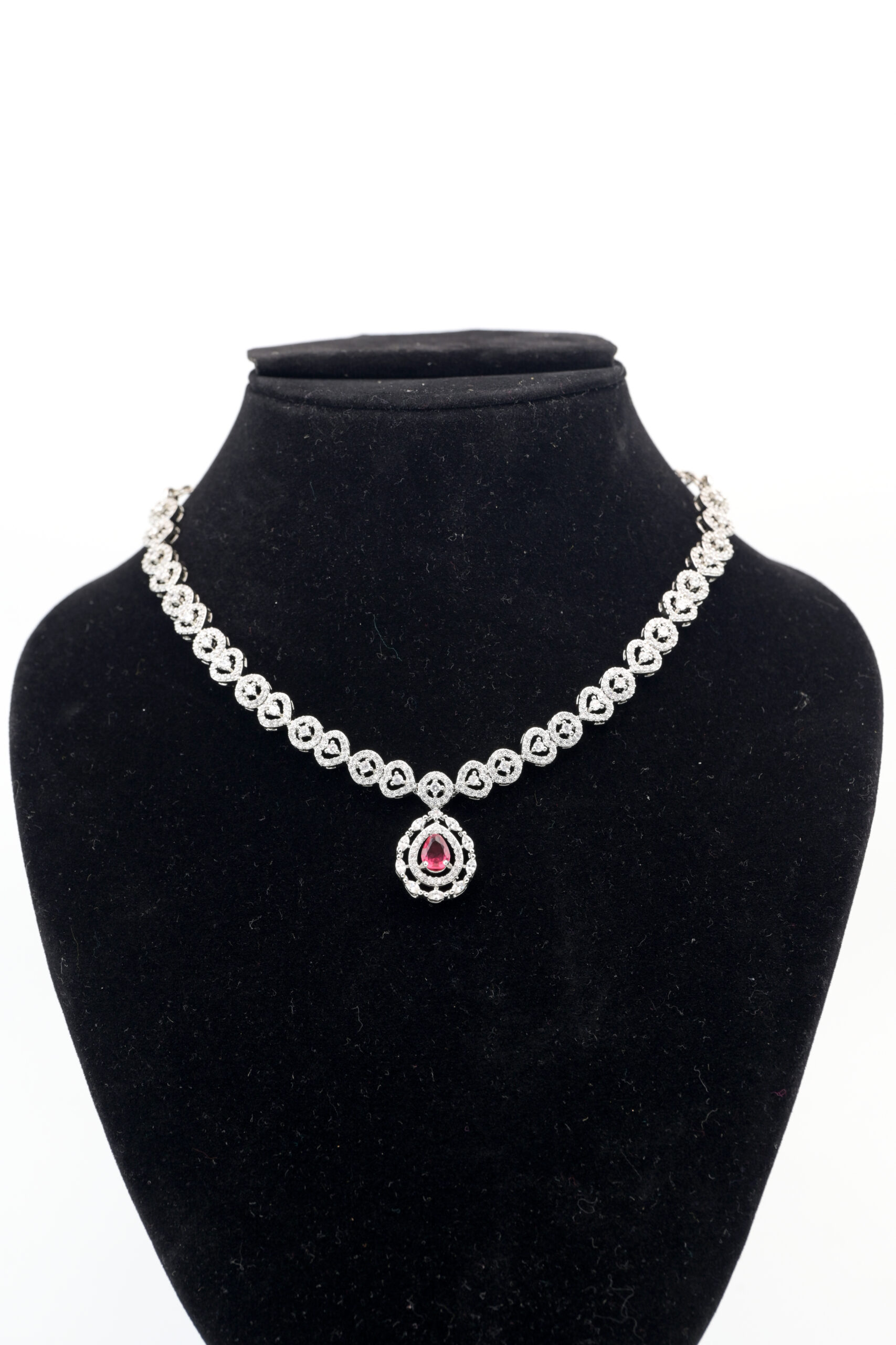 - Necklace: Articulated chain of round, sparkling cubic zirconia clusters leading to a teardrop-cut deep ruby-red cubic zirconia pendant, encircled by a halo of multi-faceted stones for captivating brilliance.