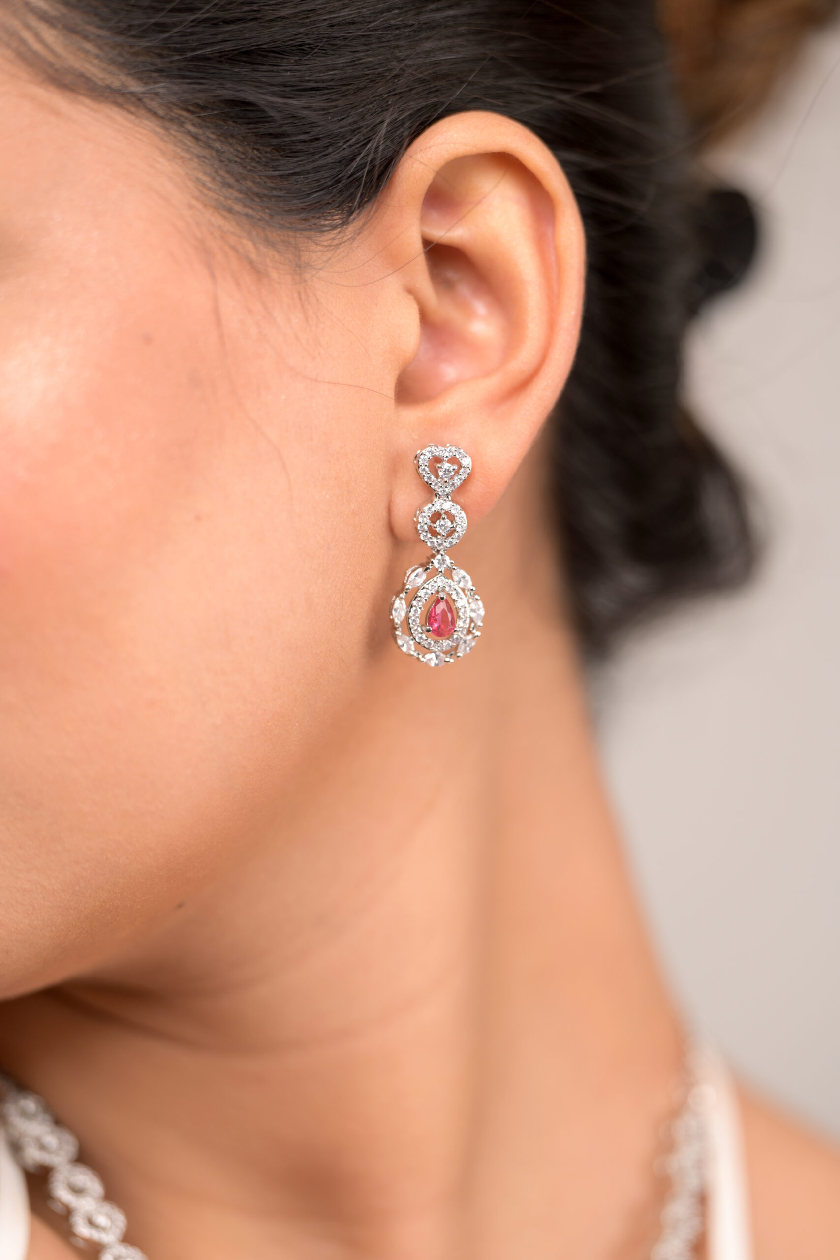 - Earrings: Three-tiered drop design featuring a heart-shaped cluster of sparkling stones above a teardrop-cut ruby-red CZ with halo, adding refined charm and movement.