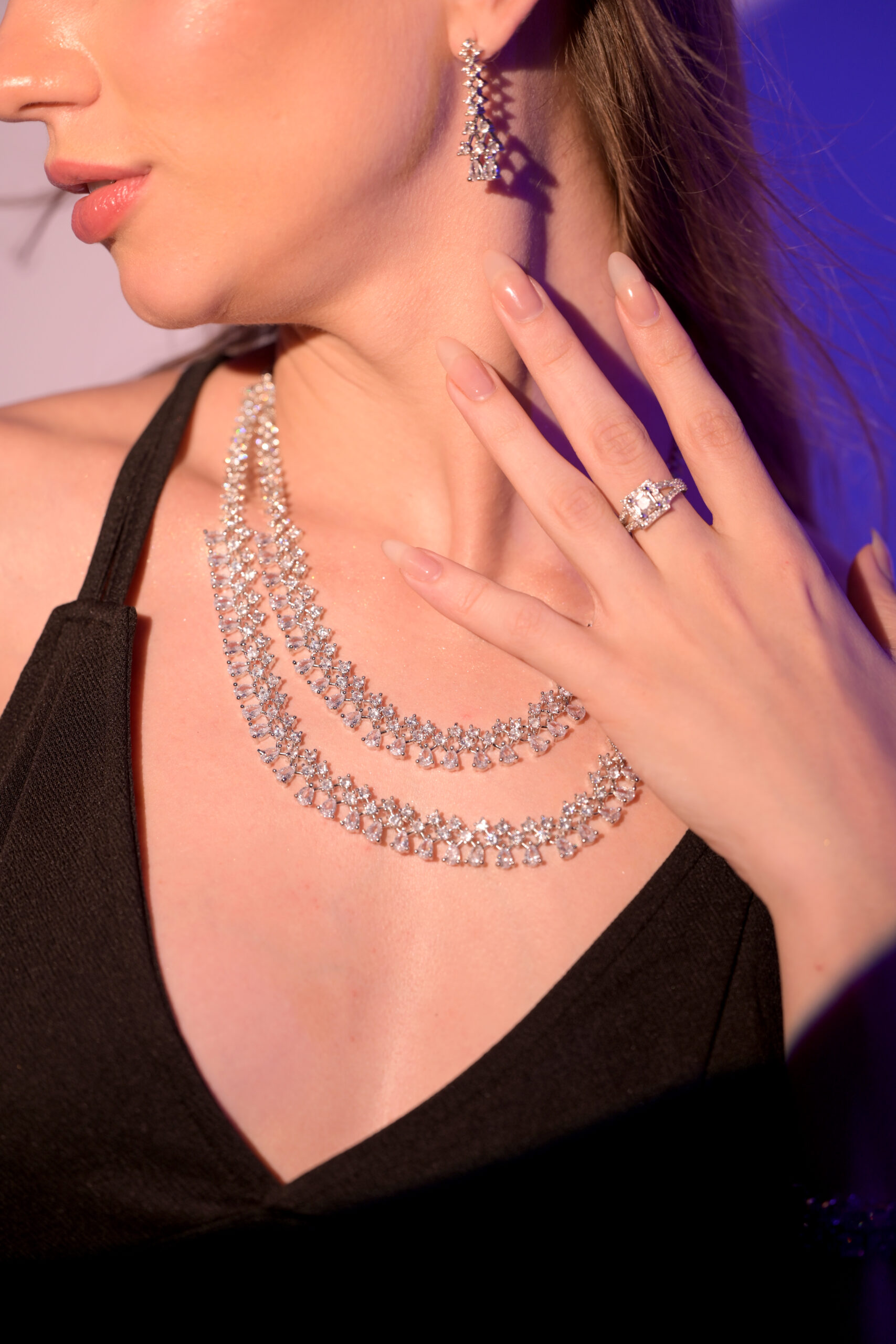 ● Necklace: Double-layered cascade featuring pear, brilliant, and square-cut CZ stones arranged for radiant sparkle.