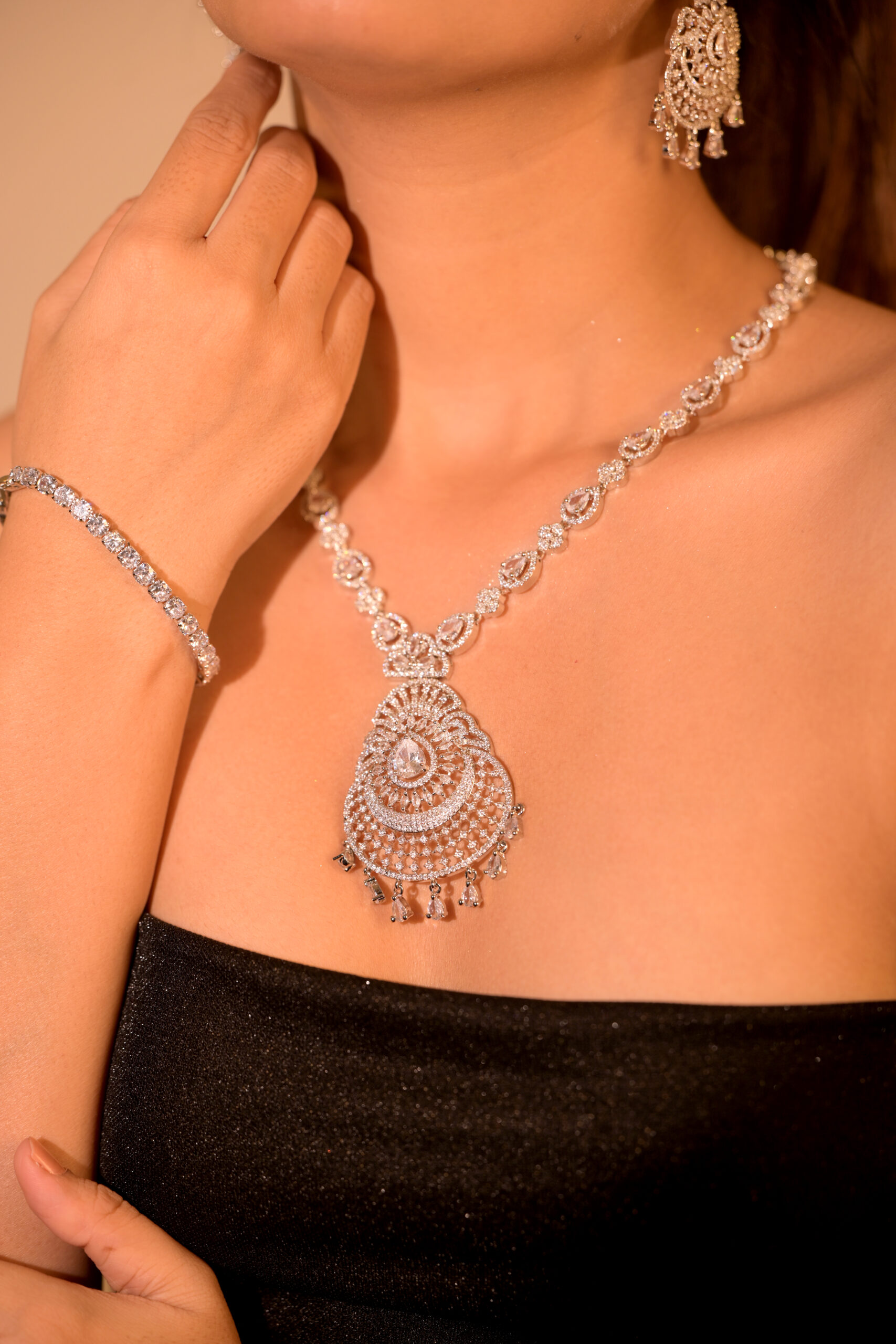 ● Earrings: Coordinated drop earrings echoing the pendant’s detailed motif, creating a balanced, elegant ensemble.
