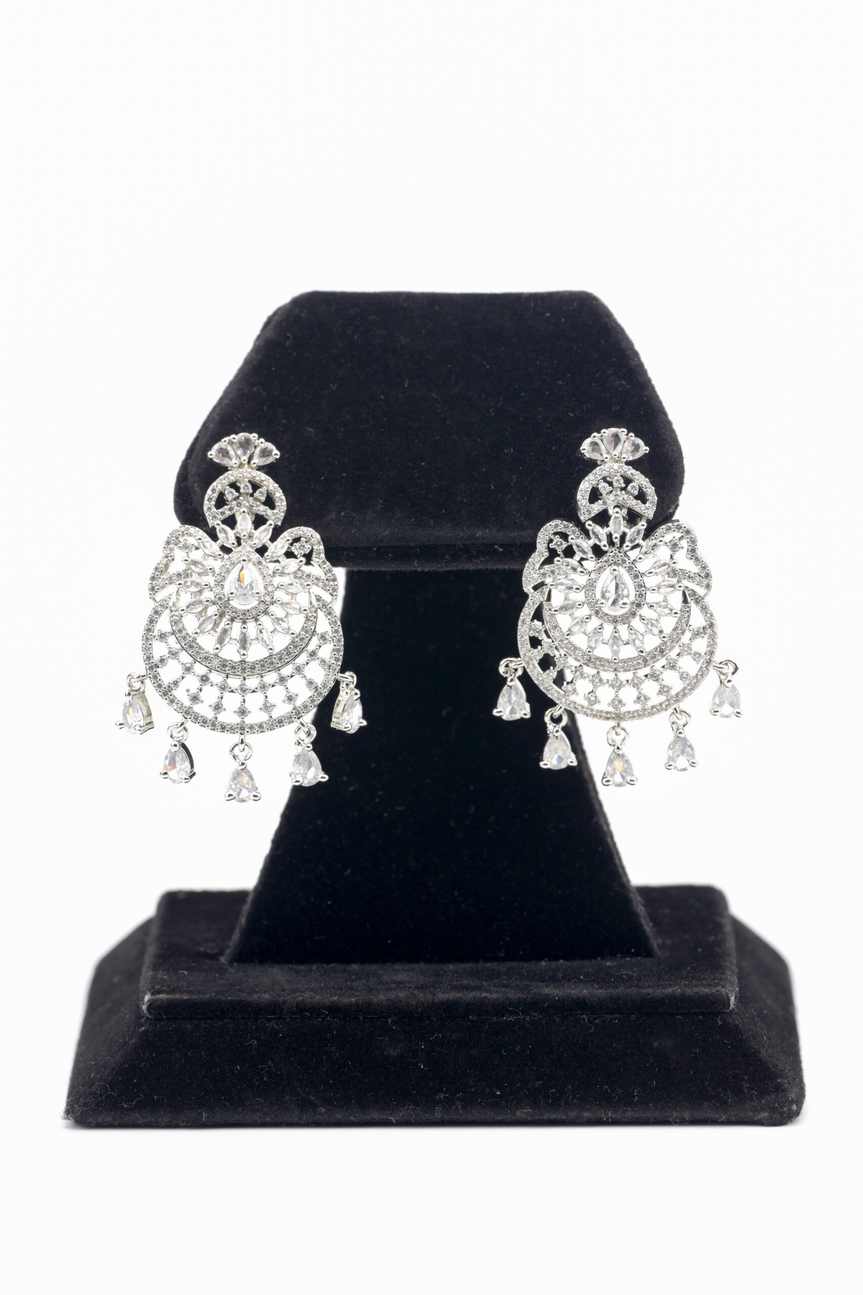 ● Necklace: A dramatic bell-shaped pendant accented with concentric rings of pavé-set cubic zirconia and pear-cut highlights for radiant brilliance.