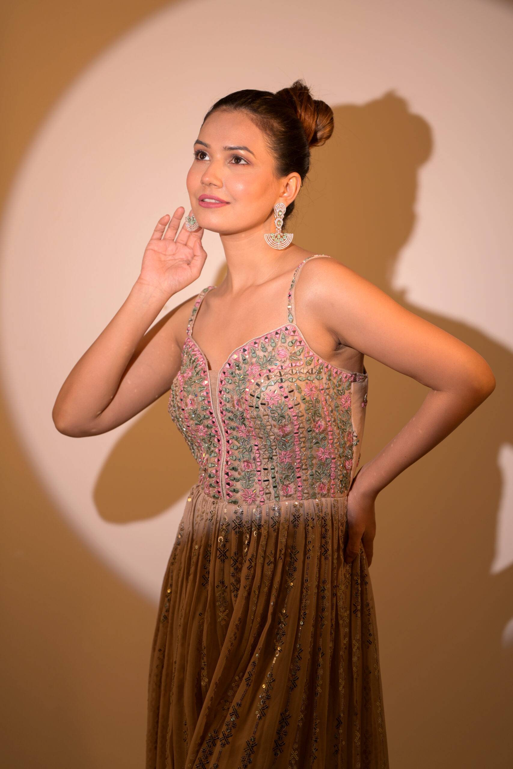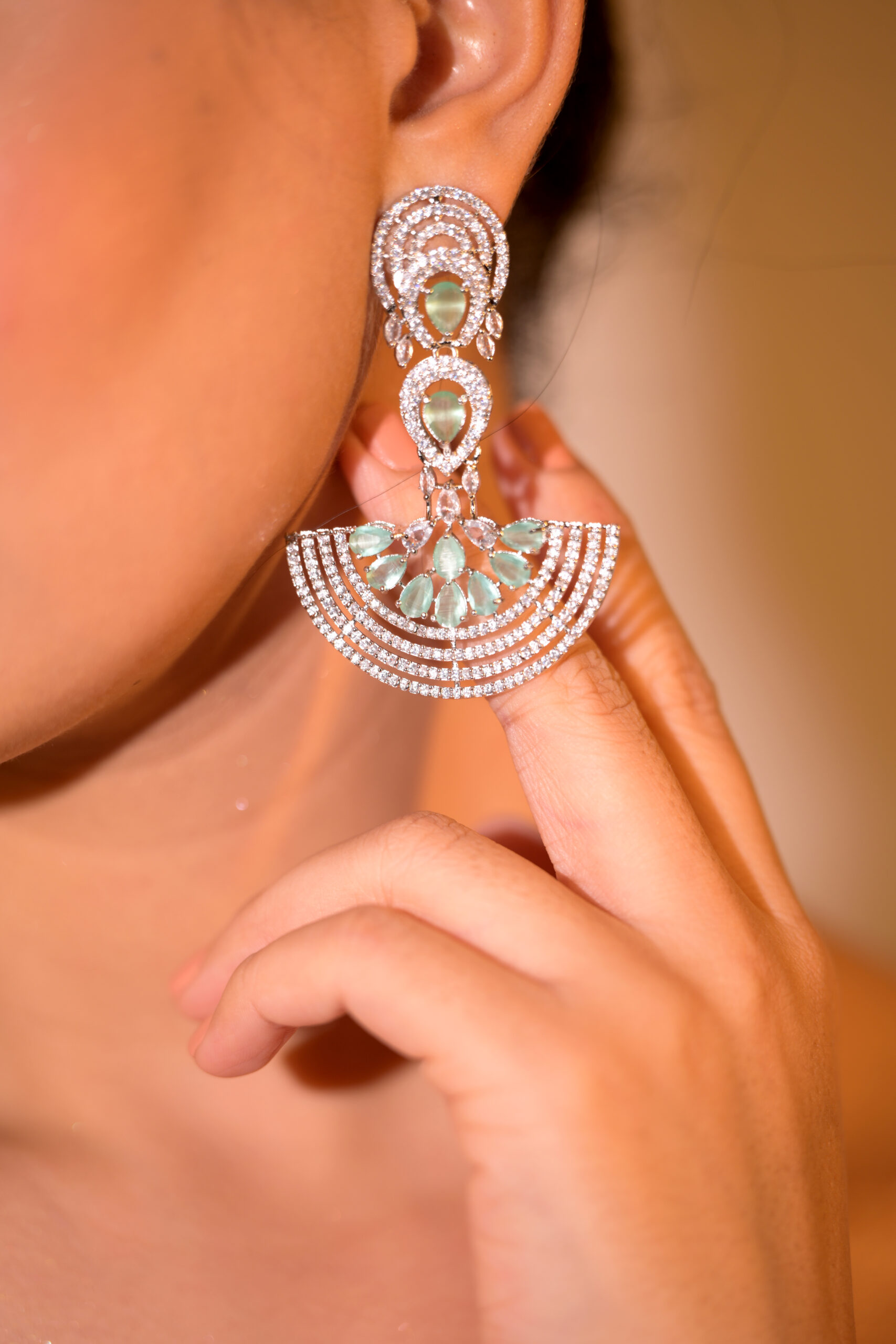● Earrings: Dramatic tiered drops with floral clusters of mint-green and clear CZ.