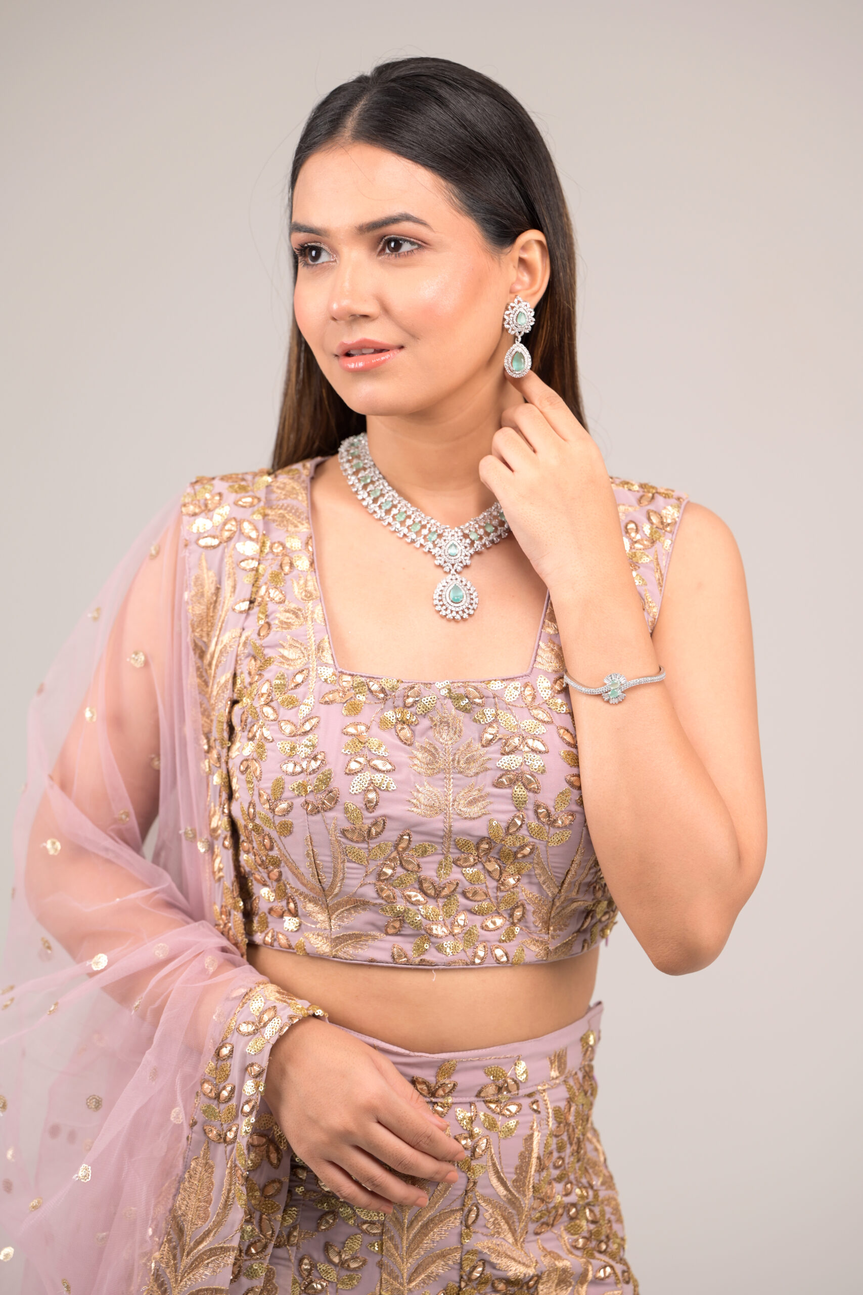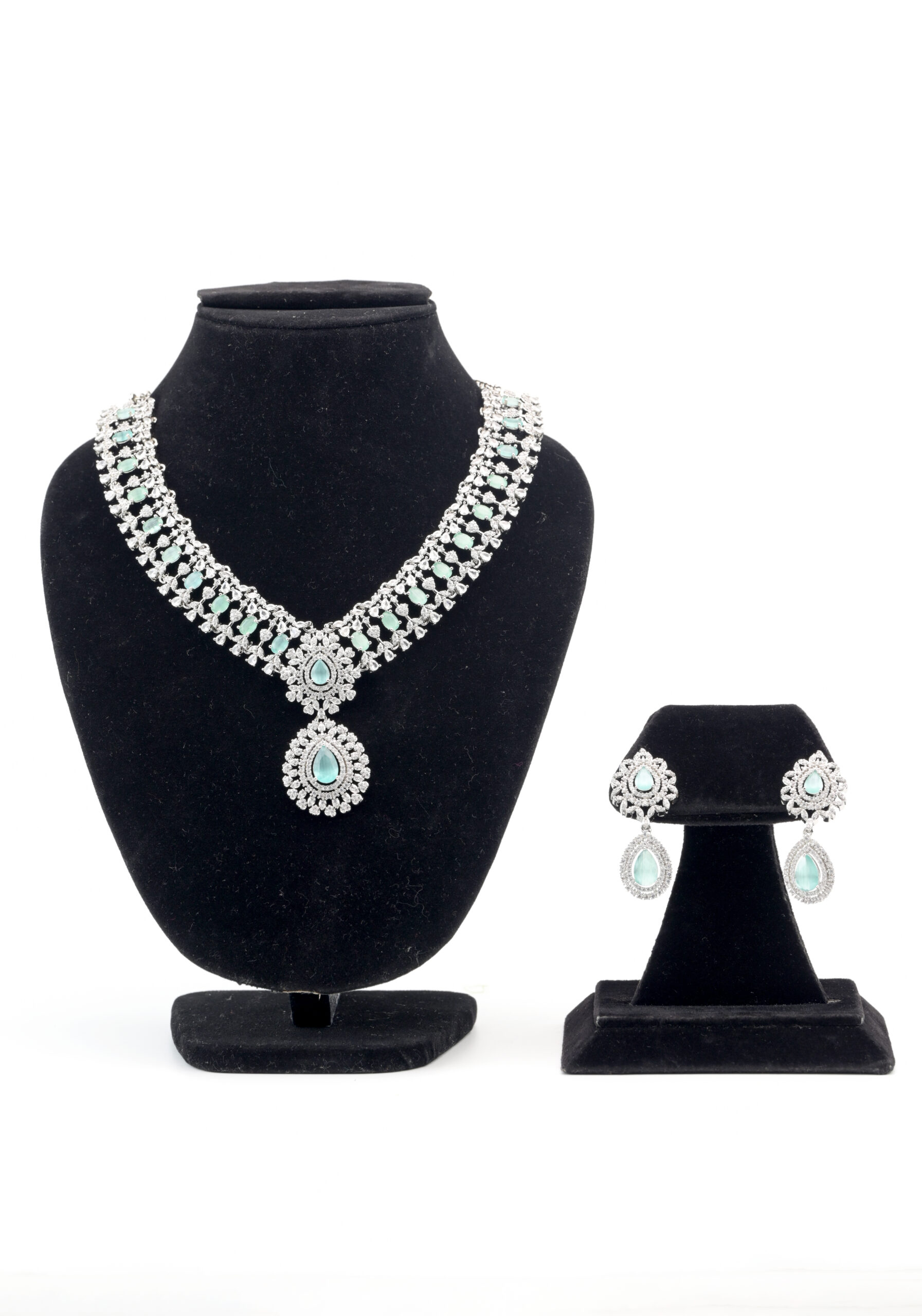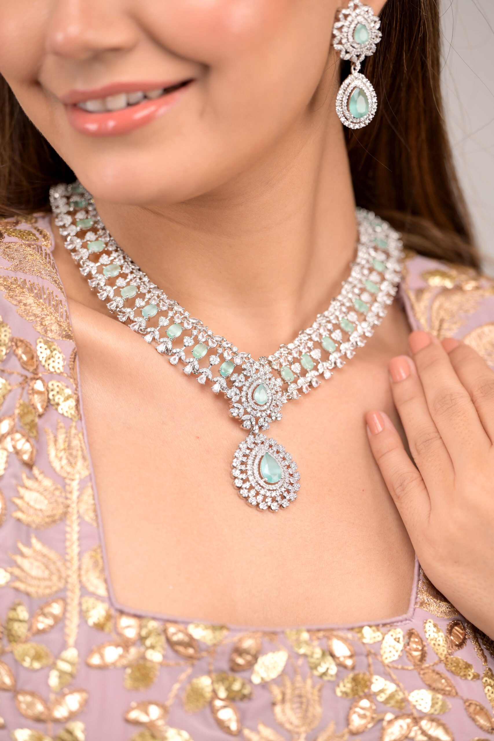 - Necklace: Striking collar of pear-cut mint green cubic zirconia stones with a soft, watercolour hue, interspersed with dazzling multi-faceted clear CZ accents.