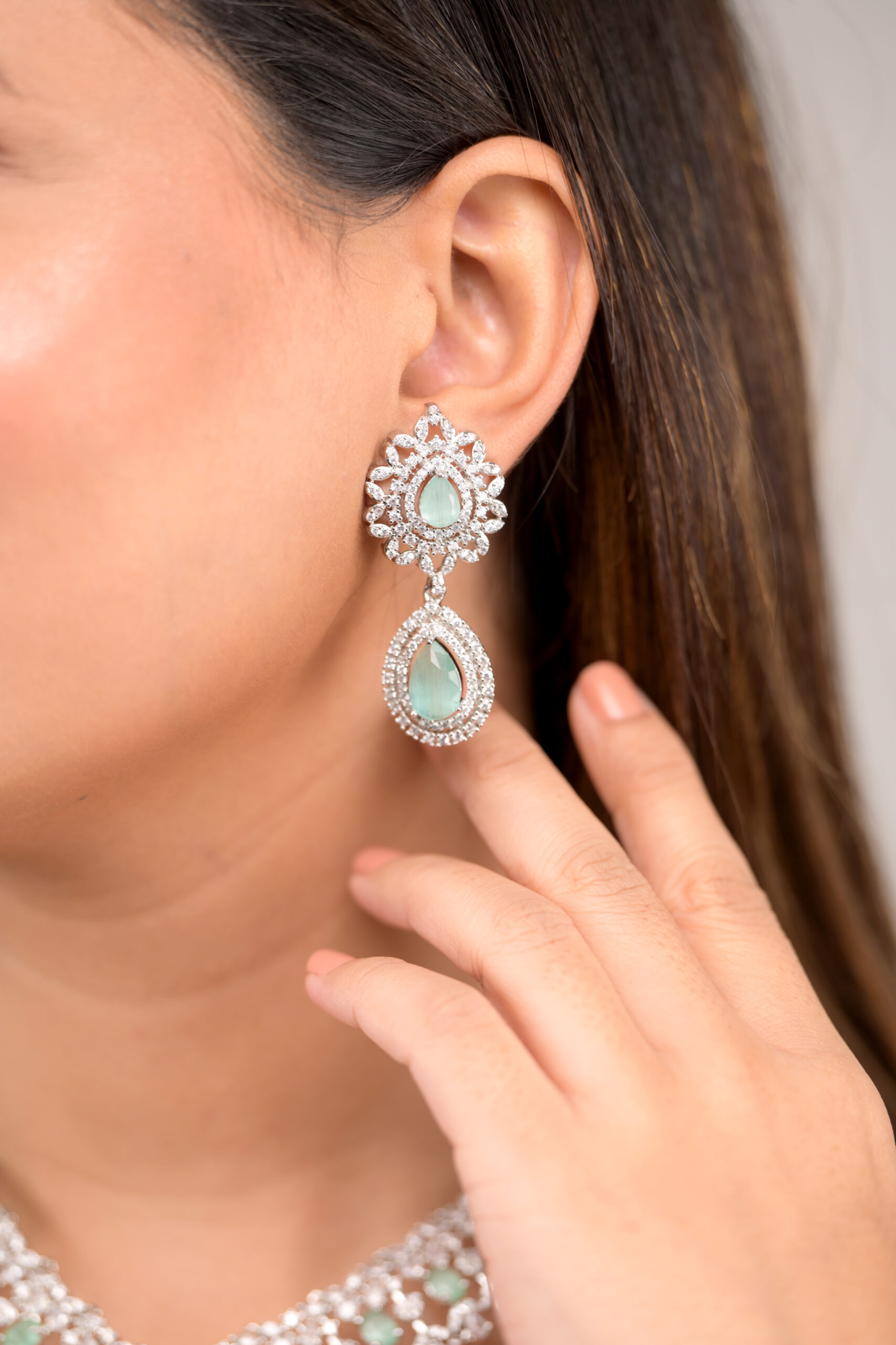 - Earrings: Cascading drops echo the necklace design, featuring a statement pear-cut mint green CZ at the base for enchanting charm.